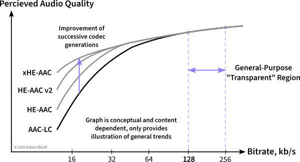 Finally, most consumers have not seen codec rate/distortion graphs. In their mind, perhaps helped by careful marketing, 256 kb/s AAC might be “twice as good” as 128 kb/s.