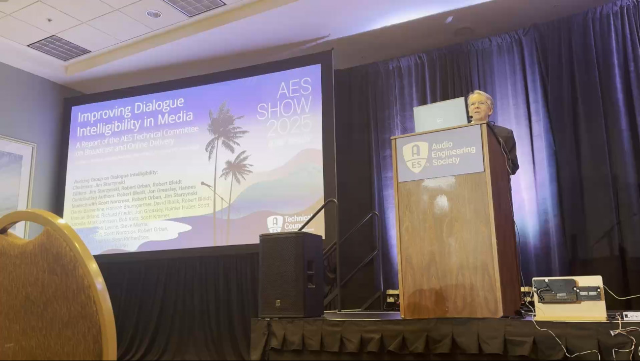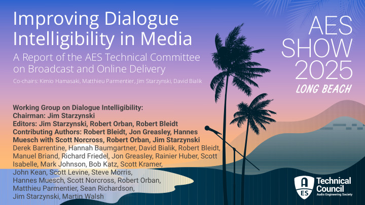 I’m a member of the AES Technical Committee on Broadcast and Online Delivery Study Group on Dialogue Intelligibility. This has been a 2 1/2 year effort to document the issues that have lead to the rise in inteligibilty complaints and recommend solutions to them. In 2025 I led the panel at the AES convention that presented our report.